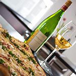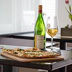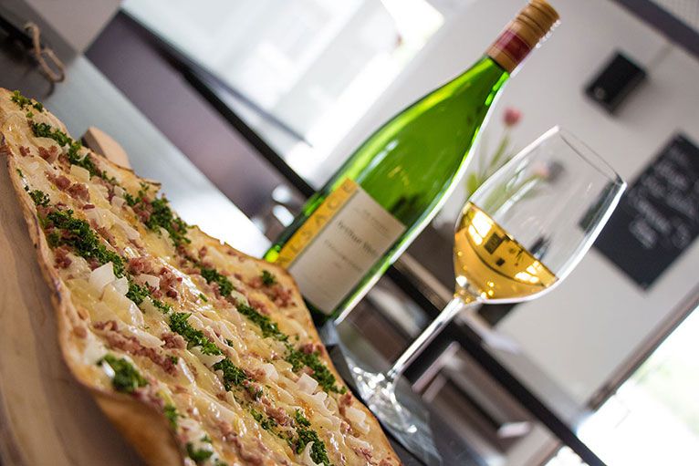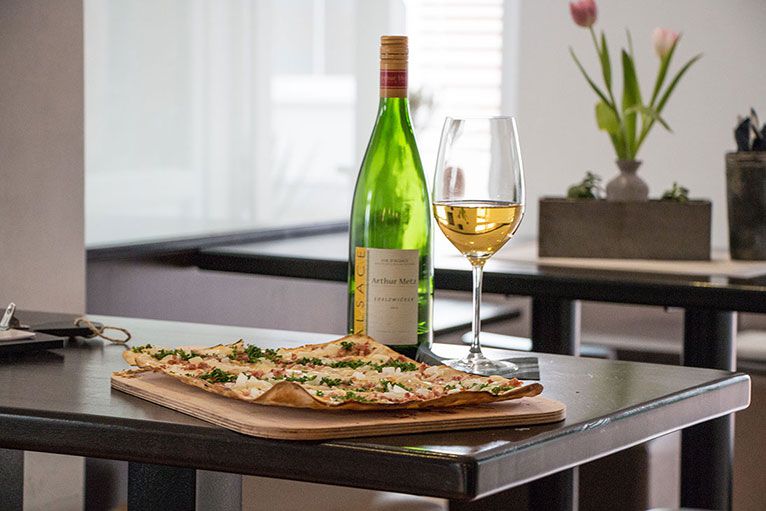Zu einem Glas Weißwein empfehlen wir einen knusprigen Elsässer Flammkuchen aus unserem Steinofen, immer frisch und selbstverständlich auch vegetarisch oder vegan erhältlich.