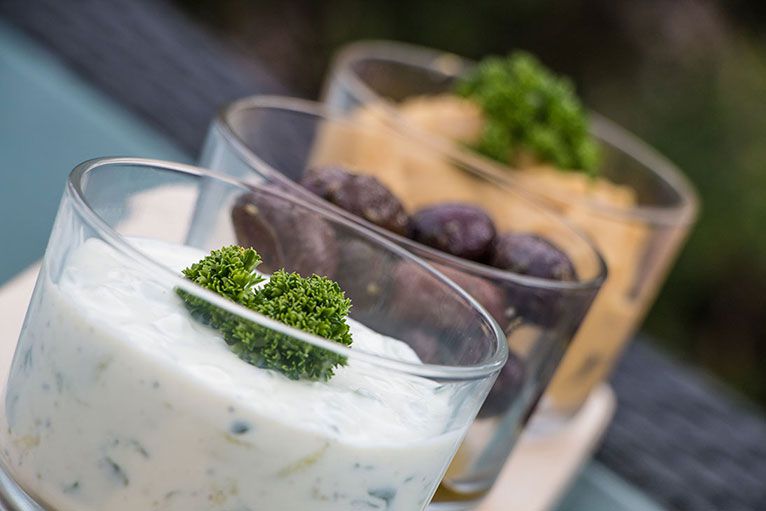 Hier gibt es immer wieder neue Leckereien zu entdecken, ein paar Klassiker wie hausgemachte Aioli, Hummus oder Goudawürfel haben wir immer. Das servieren wir auch nach Küchenschluss.